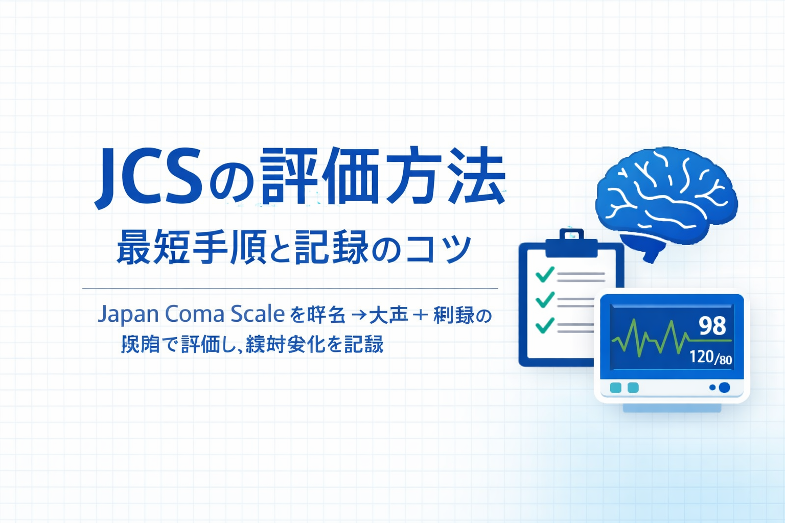 JCS は「安全の確保 → 段階刺激 → JCS 記録 → 同条件で再評価」というリズムを固定すると、現場での迷いが減ります。まずは刺激条件をそろえ、点数だけでなく “戻りやすさ” まで記録して、経時変化を追える形に整えていきましょう。