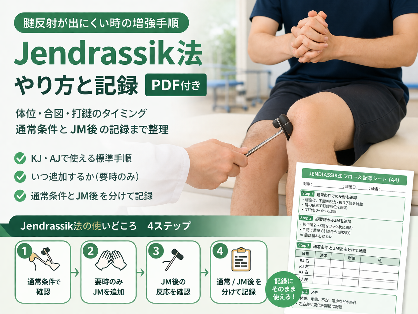 通常条件と JM 後を並べて残すと、反射の変化を比較しやすくなります。今回の記録シートは、「要時のみ JM を追加」という実務の流れに合わせて、 KJ 右・ KJ 左・ AJ 右・ AJ 左を 1 枚で整理できる形にしています。教育や申し送りでも使いやすいよう、 Step 3 の表の余白と視認性を調整した版です。