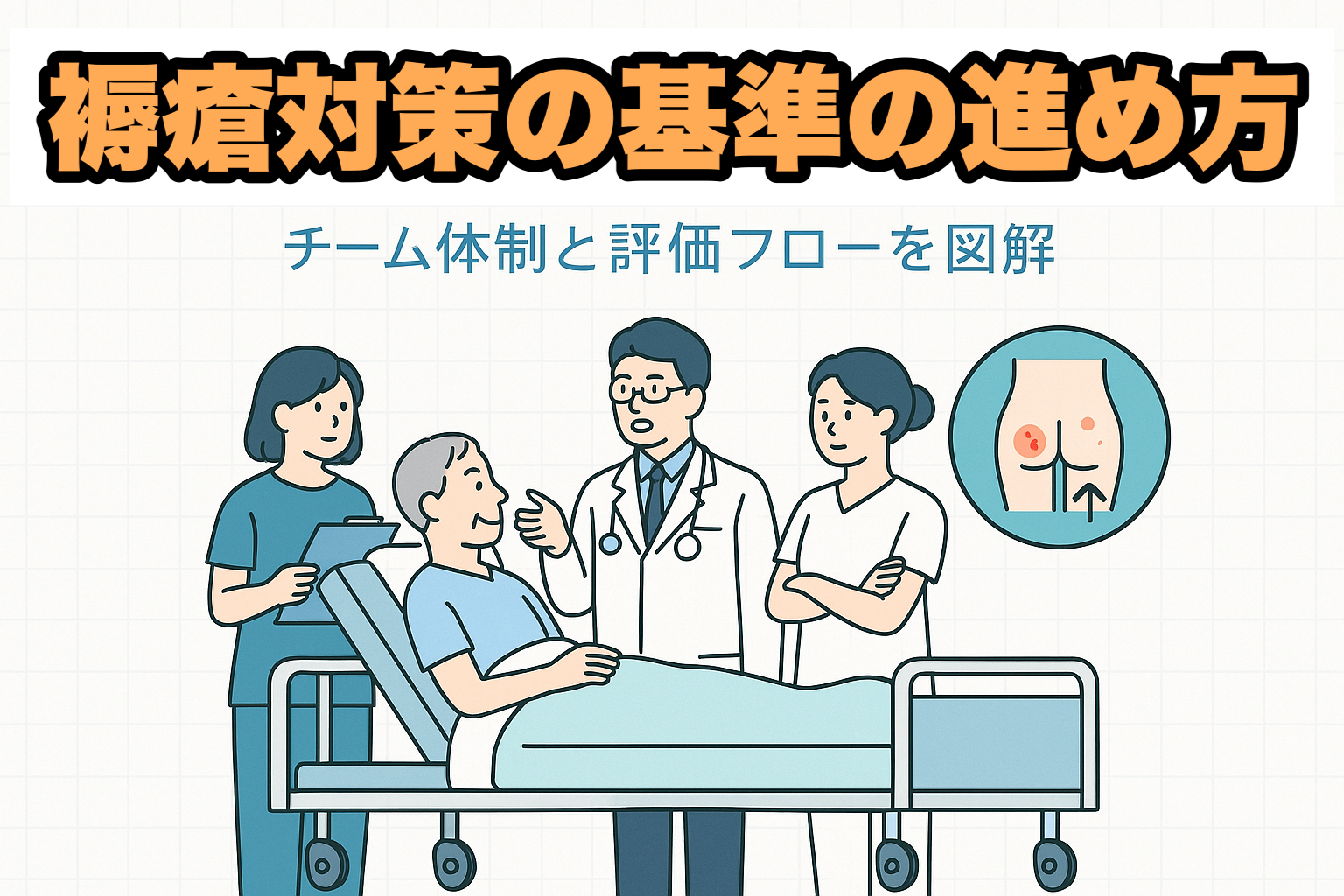 「褥瘡対策の基準」は条文だけを読むと分かりにくいですが、院内体制づくりの流れとして見ると 6 ステップに整理できます。①現状把握(チーム・マニュアル・危険因子評価の運用状況・体圧分散マットレス等の配置)、②褥瘡対策チームの設置と役割分担、③危険因子評価ツールと「誰が・いつ評価するか」の決定、④診療計画書様式と記録ルールの統一、⑤チームラウンド・委員会・職員研修の実施と記録、⑥適時調査・個別指導を見据えた資料保管です。③〜⑤で実際に使用するツールや様式は、危険因子評価票運用プロトコル、褥瘡対策に関する診療計画書、褥瘡対策に係る報告書(様式 5 の 4) などと合わせて設計していくとスムーズです。
