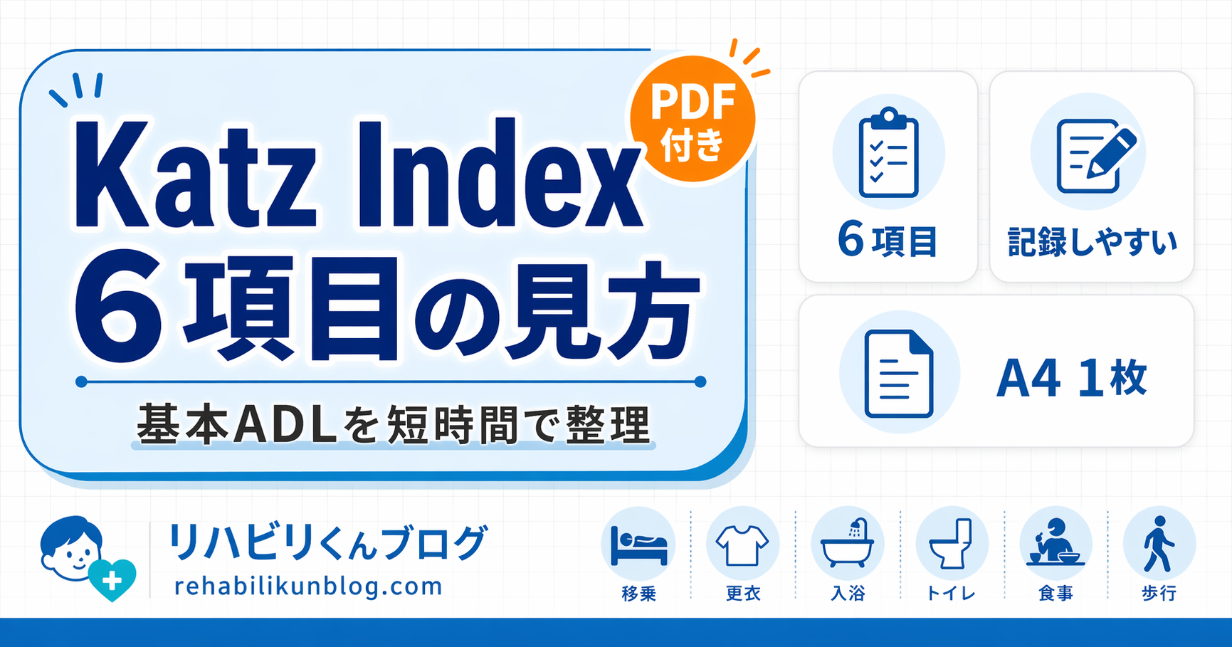 そのため、 Katz Index は「詳しく測る主役の尺度」というより、初回や高齢者評価でまず全体像をつかむための簡便スクリーニングとして置くと使いやすくなります。 ADL 評価全体の位置づけを先に整理したい方は、 理学療法士の ADL 評価スケール|種類と使い分け【比較表】 もあわせて確認すると流れがつかみやすくなります。