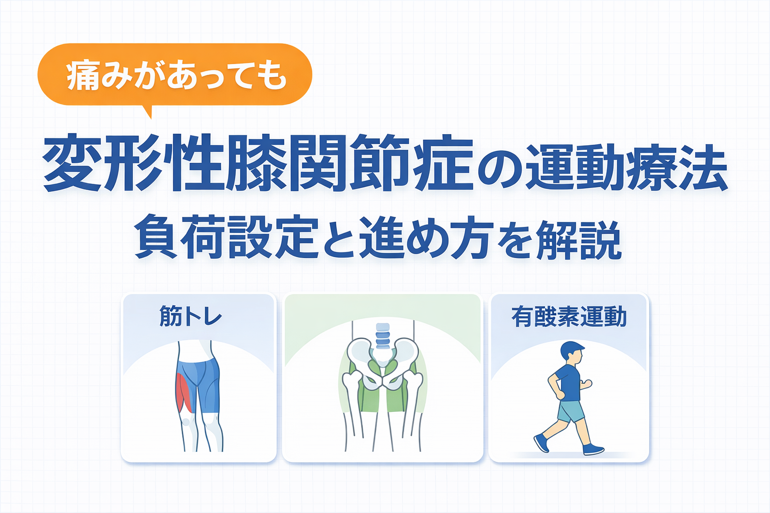 変形性膝関節症の運動療法で大切なのは、痛みがあるから止めることではなく、症状に合わせて負荷を調整しながら続けることです。膝 OA では、筋力トレーニングだけでなく、有酸素運動や日常動作に近い練習を組み合わせることで、痛みや生活機能の改善につなげやすくなります。
