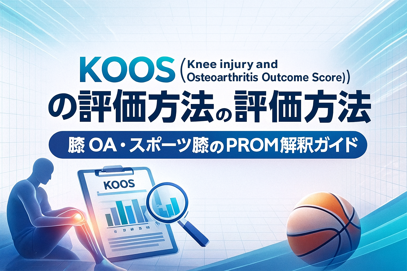 膝 OA やスポーツ膝のリハビリでは、「レッドフラッグの除外 → X 線・MRI 所見の確認 → 関節可動域・筋力・バランス・歩行評価 → KOOS など PROM による主観評価 → 目標設定と治療計画 → 再評価」というリズムを押さえておくと、評価結果を治療戦略に結びつけやすくなります。KOOS は、日常生活からスポーツレベルまでカバーしつつ、患者視点の QOL まで含めて追えるスケールなので、TKA・HTO・保存療法のいずれでも「何がどこまで良くなったか」を共有しやすい指標です。