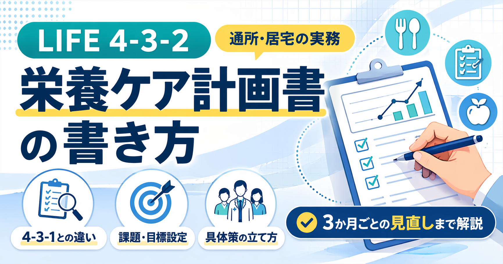 LIFE 4-3-2 は、通所介護、通所リハビリテーション、地域密着型通所介護、小規模多機能型居宅介護などで使う栄養ケア計画書です。役割は「今どうなっているか」を書くことではなく、「これから何をするか」を明確にすることにあります。