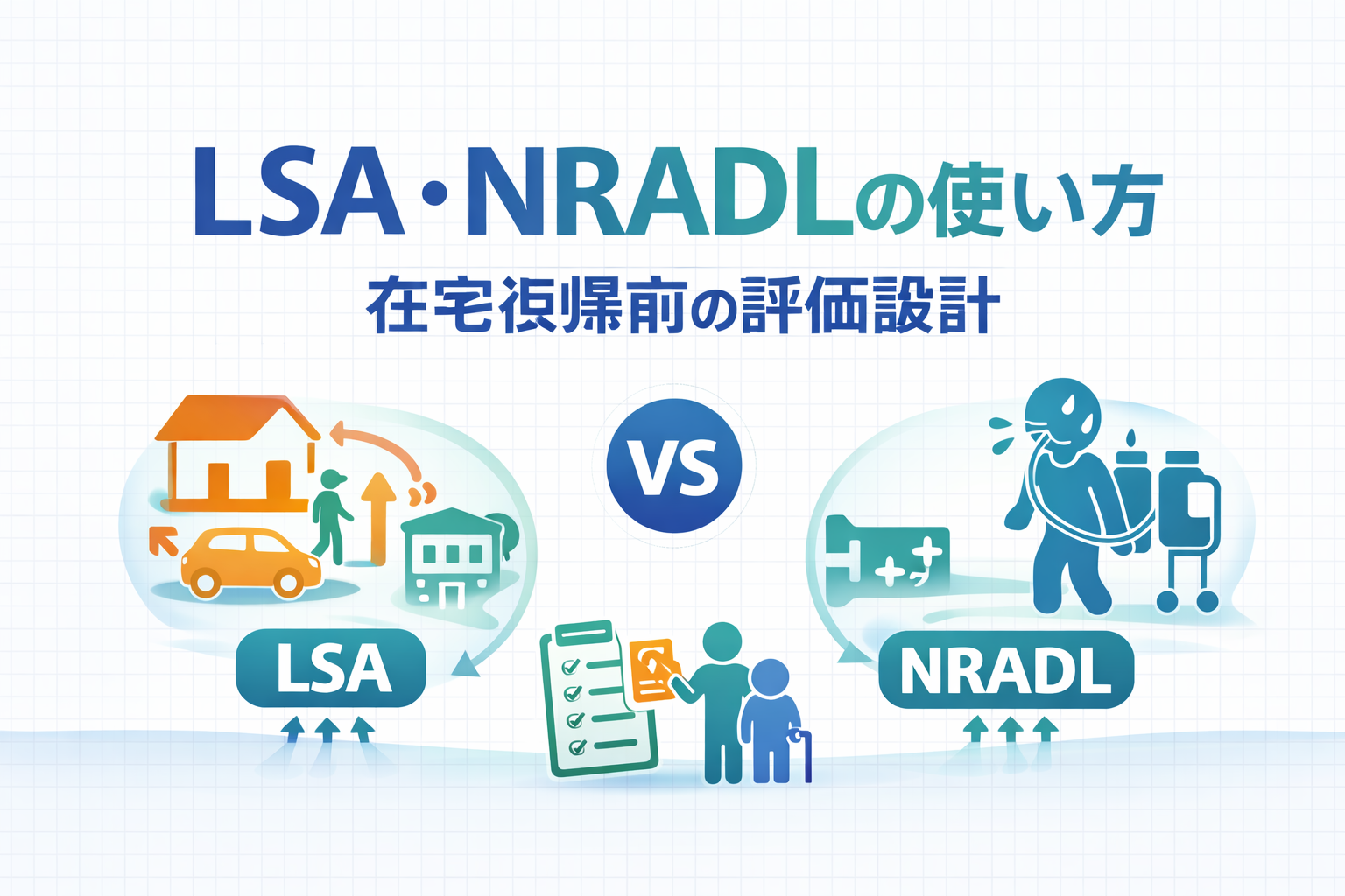 LSA と NRADL は、点数だけだとチームが動きにくいです。記載は、条件(同伴・補助具・休息・酸素)と、崩れる場面(方向転換・疲労後・入浴)をセットで残すと、退院後の支援が具体化します。