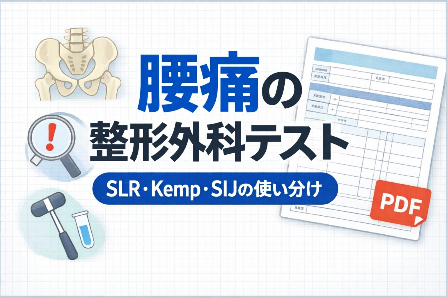 腰痛・坐骨神経痛で迷いやすいのは、テスト名をたくさん知ることではなく、最初に何をやり、どこで止め、何を記録に残すかです。このページでは、腰部でよく使う整形外科テストを「症状パターン別の最小セット」として整理し、評価 → 介入 → 再評価までつなげやすい形にまとめます。