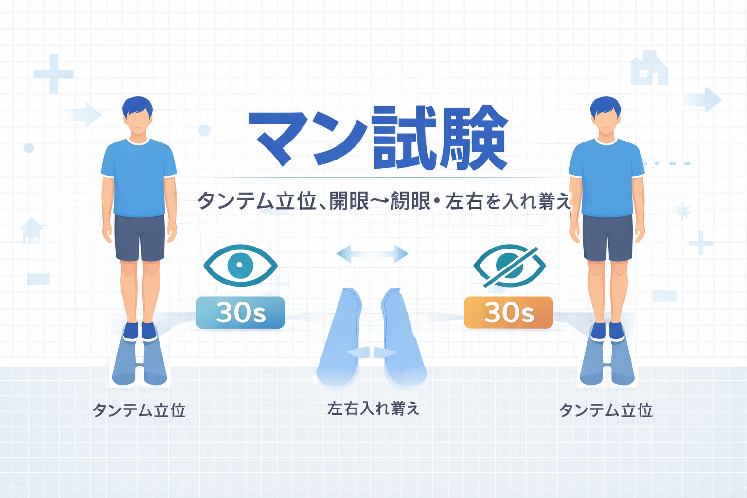 マン試験は、足を前後一直線上に置くタンデム立位(後足の足尖と前足の踵を接する)で姿勢保持を観察します。開眼・閉眼を比較し、動揺の増大や転倒傾向の有無、転倒方向を記録します。前後の足を入れ替えて左右差も確認します。