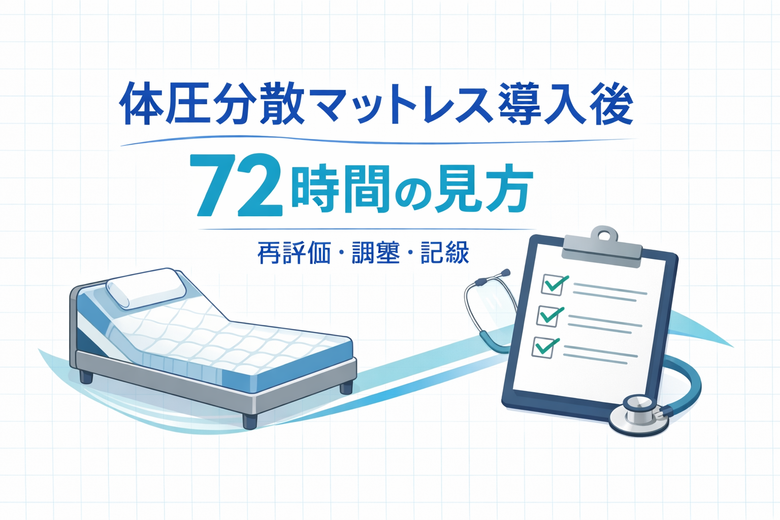 結論として、体圧分散マットレスは「入れた瞬間」に正解が決まるのではなく、導入当日から 72 時間で 皮膚・睡眠・離床 がそろうかを見て初めて適合と判断します。本記事は、候補の支持面が決まったあとに、何を固定し、何を観察し、どこで調整・継続・見直しを分けるかを整理する実務ページです。