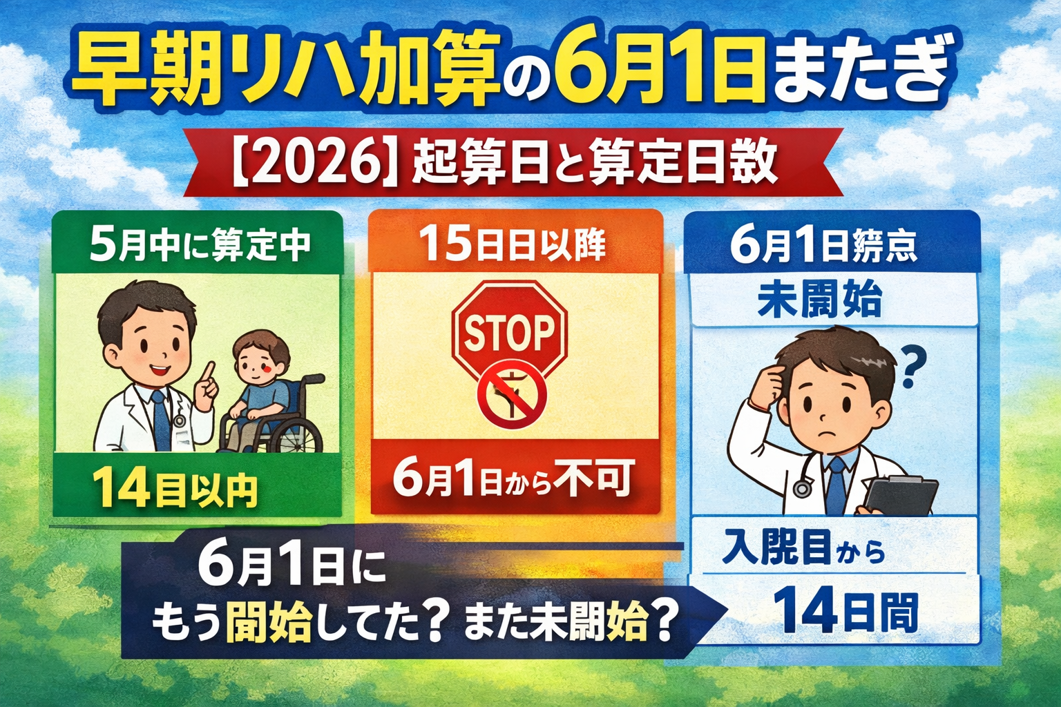 このページで答えるのは、5 月 31 日以前に入院した患者について、6 月 1 日をまたぐときに早期リハ加算をどう扱うかです。具体的には、① 5 月中に算定開始済みで 6 月 1 日時点で 14 日以内、② 5 月中に算定開始済みで 6 月 1 日時点で 15 日目以降、③ 6 月 1 日時点で未開始、の 3 パターンを扱います。
