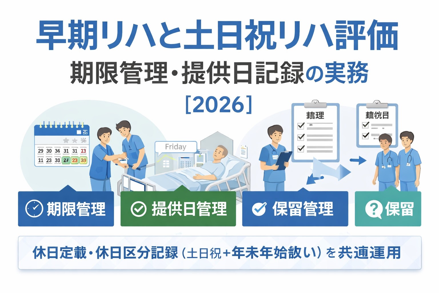 このページは、令和 8 年改定文脈における「早期リハ」と「土日祝リハ」を、休日運用の実務として整理する専用ページです。総論で制度の全体像を押さえたうえで、ここでは「いつまでに何を行うか」「休日提供をどう記録するか」に絞って解説します。