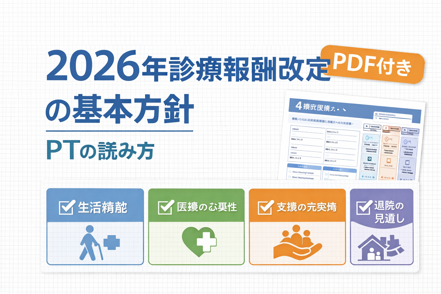改定対応で効くのは、制度の暗記より「会議で同じ言葉を使えること」です。ここでは、公式の 4 視点を PT の業務へどう訳すかだけを短く整理します。