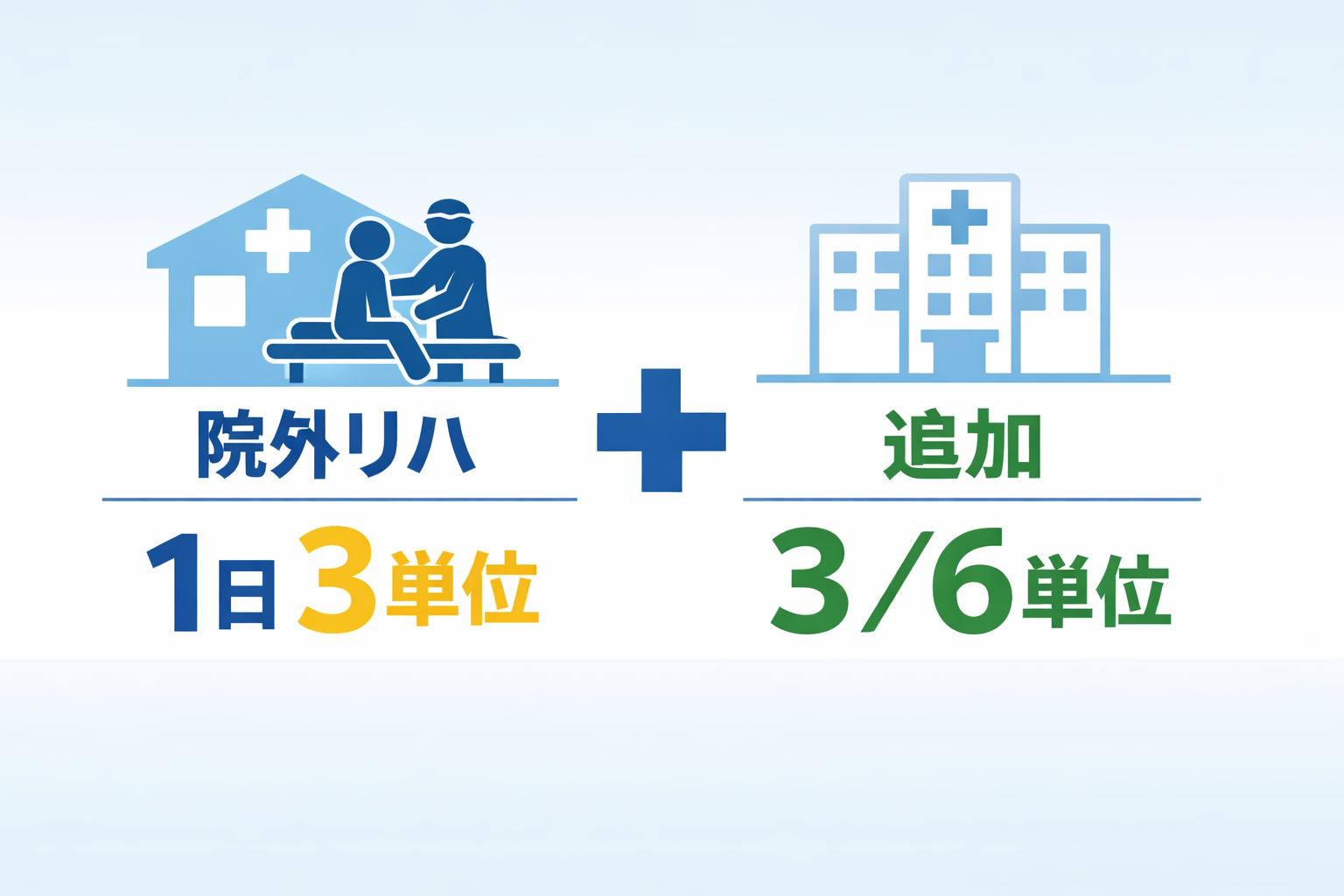 令和 8 年 診療報酬改定で、医療機関外(院外)で行う疾患別リハビリテーションは、 1 日 3 単位が原則のまま、やむを得ず超える必要がある日に限って、一連の入院期間で合計 3 単位(別に定める患者は 6 単位)まで追加で扱える形に整理されました。