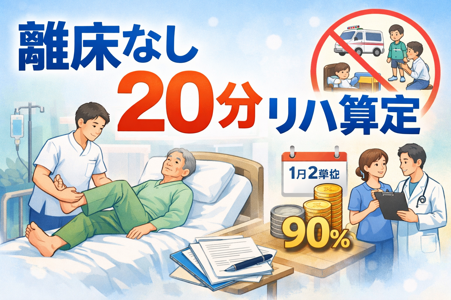 このページは、令和 8 年度 診療報酬改定で明文化された「離床を伴わずに行う個別療法( 20 分以上 )」の扱いを、対象患者、除外、所定点数の 100 分の 90、 1 日 2 単位上限、 3 単位例外時の摘要に絞って確認するための記事です。通知の文言をそのまま追うだけでなく、現場で止まりやすい「どこから先に見るか」まで整理しています。