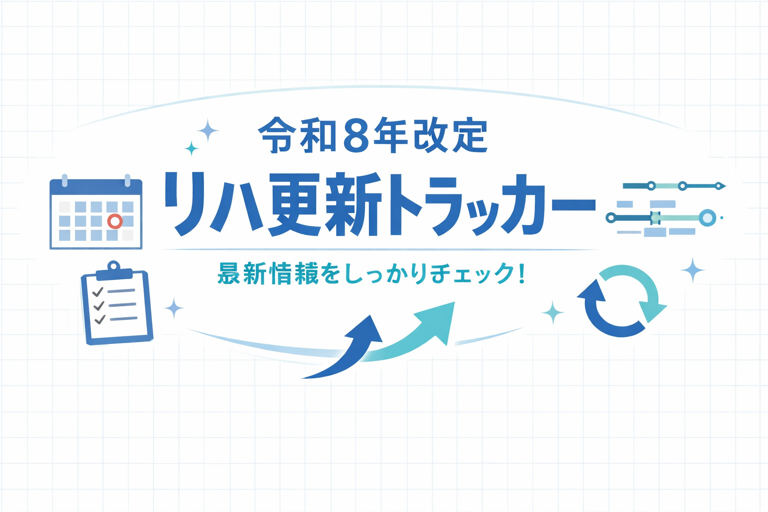 本ページは、令和 8 年改定のリハ領域について、「いつ更新が入り」「どの領域に影響し」「どの記事へ反映したか」を時系列で管理するためのトラッカーです。詳細解説は個別記事に分け、ここでは更新差分の監視と反映状況の確認に絞ります。