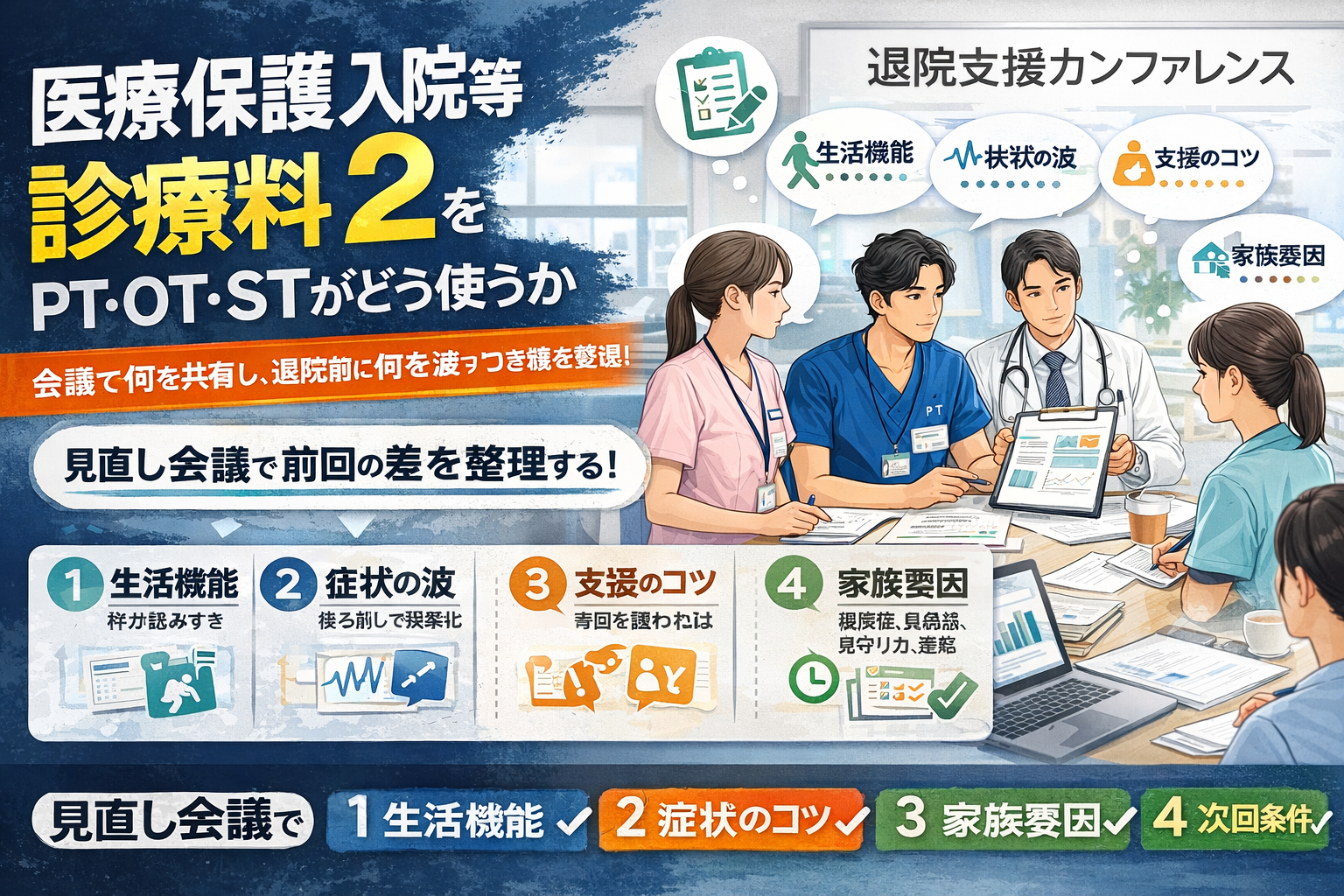 医療保護入院等診療料 2 は、精神科の入院医療で多職種による退院支援を継続的に行うことを評価する仕組みです。 PT ・ OT ・ ST にとって大切なのは、「算定できるか」を追うことより、会議で何を共有し、見直し時に何を比較し、退院前に何を地域へ渡すかをそろえることです。