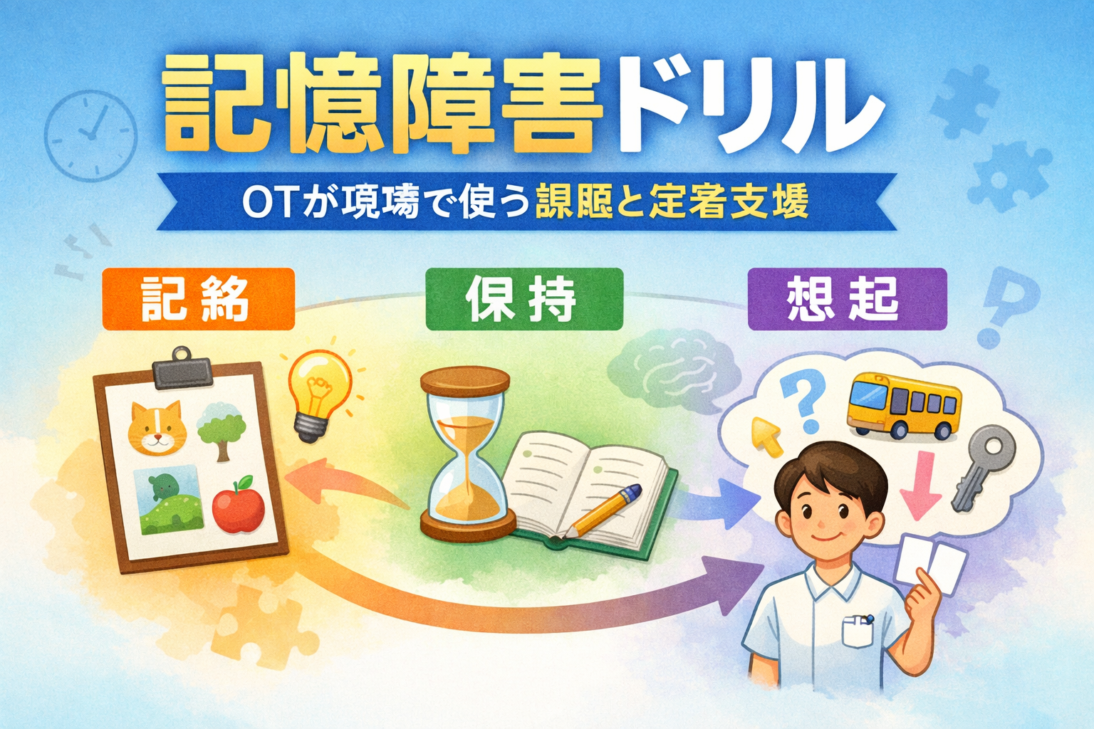 本記事では、 OT が現場で運用しやすいように、評価→課題選定→実施→記録の流れで、記憶障害ドリルを実務の型として解説します。目的は「できた/できない」で終わらせず、次回調整に直結する判断材料を残すことです。