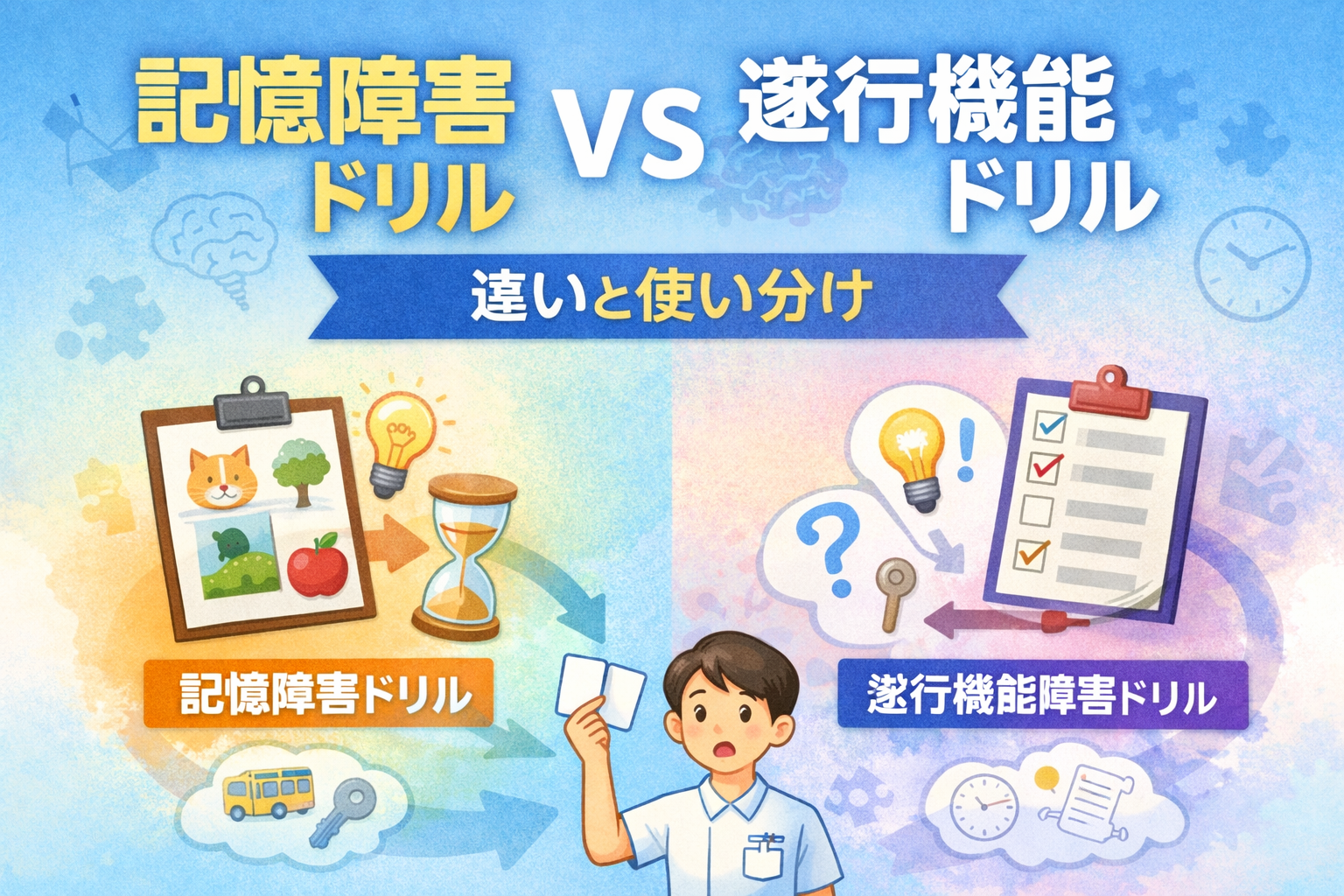 記憶障害と遂行機能障害は同時に見えることが多く、ドリル選定が混ざりやすい領域です。実務では「覚えられない」のか「段取りが崩れる」のかを失敗する場面で分けると、課題選定と記録が安定します。