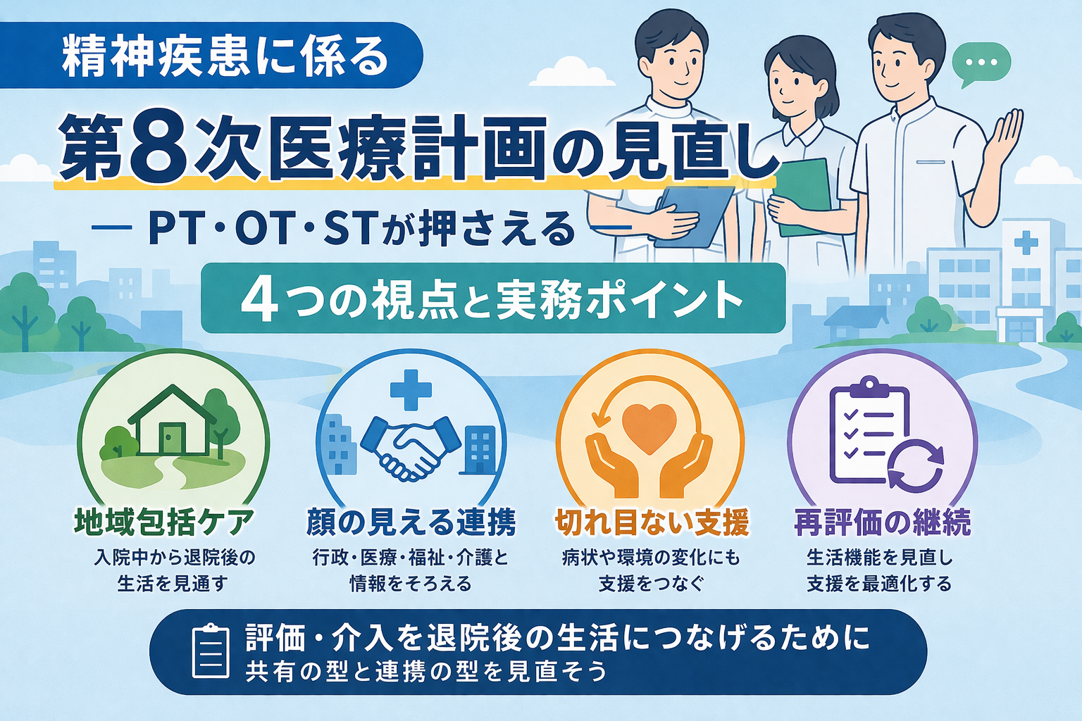 精神疾患に係る第 8 次医療計画の見直しは、精神科だけの話ではありません。現場目線で読むと、入院中の関わりを退院後の生活につなげること、医療だけでなく障害福祉や介護と情報をそろえること、本人の意向に沿って切れ目なく支援することを再確認する実務資料です。 PT ・ OT ・ ST にとっては、評価や介入の前提になる「共有の型」と「連携の型」を見直すきっかけになります。