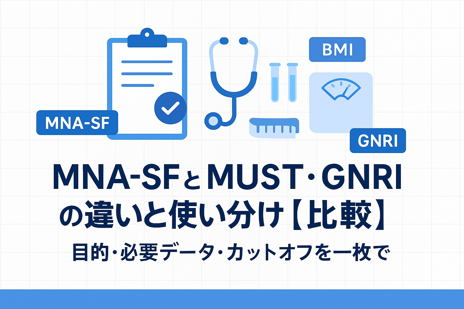 現場には MNA®-SF ・ MUST ・ GNRI など複数のツールがあり、対象・必要データ・判定軸が異なります。本稿は「目的」「項目数」「カットオフ」「強み/注意」で横並び比較し、場面に応じた最短の選択肢を示します。