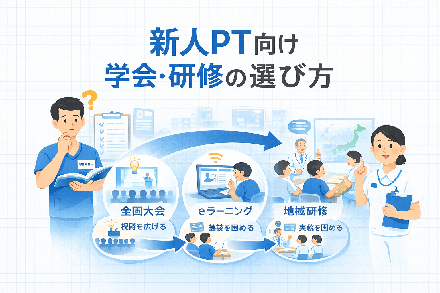 この記事では、新人 PT が学会・研修を選ぶときの基準、最初に学びやすいテーマ、全国大会と地域研修の使い分け、よくある失敗を整理します。入職前後の全体像から先に見直したい方は、PT キャリアガイドの全体像もあわせて確認すると流れがつかみやすくなります。