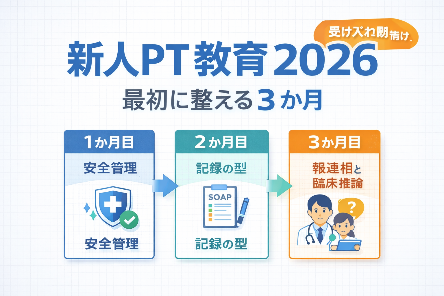 2026 年の新人 PT 教育は「安全 → 記録 → 報連相」を受け入れ側が先に整えると回りやすくなります