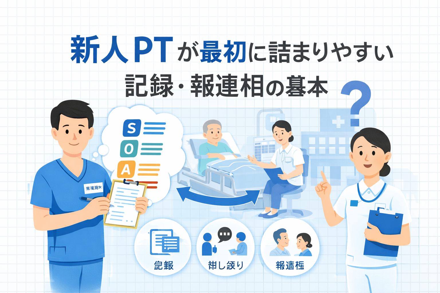 新人 PT の安全管理は、技術より先に「止め時」と「相談の使い方」を固めることが近道です。続けて読むなら、まずは記録・報連相の基本を押さえ、そのうえで入職全体の流れを確認すると整理しやすくなります。
