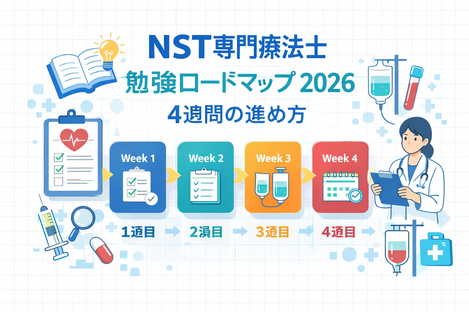 NST 専門療法士の勉強では、最初から細かい知識を広く覚えようとすると、かえって何を優先すべきか見えにくくなります。先に固めたいのは、栄養評価 → 問題点の整理 → 経路の考え方 → 再評価 という流れです。この記事では、この流れを 4 週間で回すための学習順をまとめました。