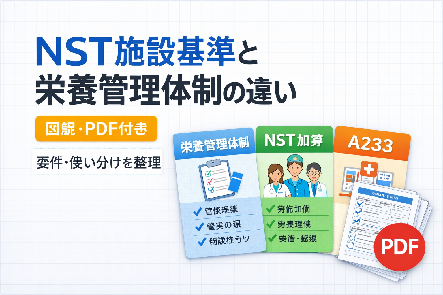 このページで答えるのは、栄養管理体制・ NST 加算・ A233 の違いと、院内で固定すべき最小運用です。一方で、 A233 の年度差分や細かな病棟要件は兄弟記事に譲り、ここでは「何を整え、誰を対象にし、何を記録すればよいか」に絞って整理します。