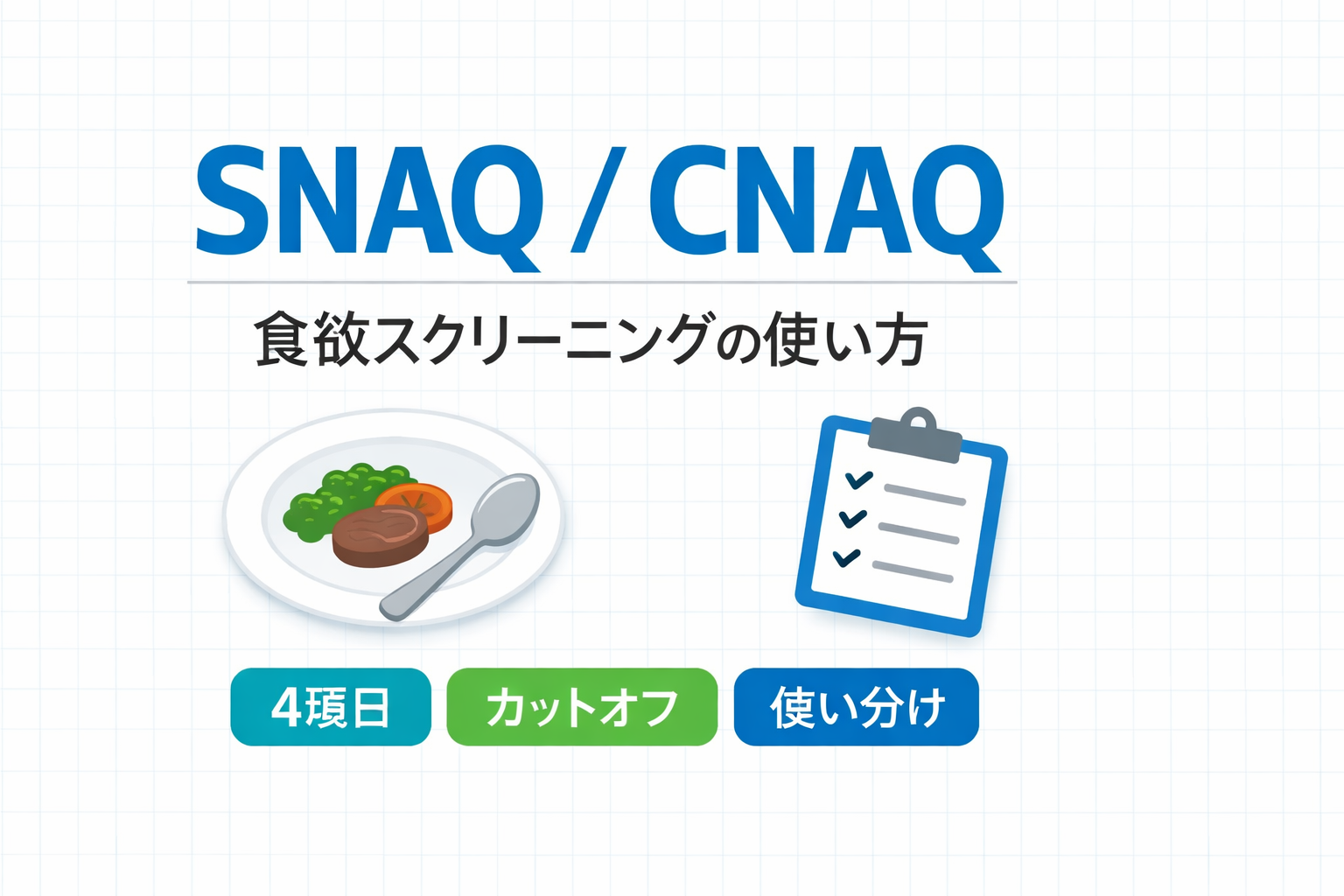 - 代表的カットオフ:SNAQ ≤ 14、CNAQ ≤ 28 の報告が多い(対象・目的で変動)。