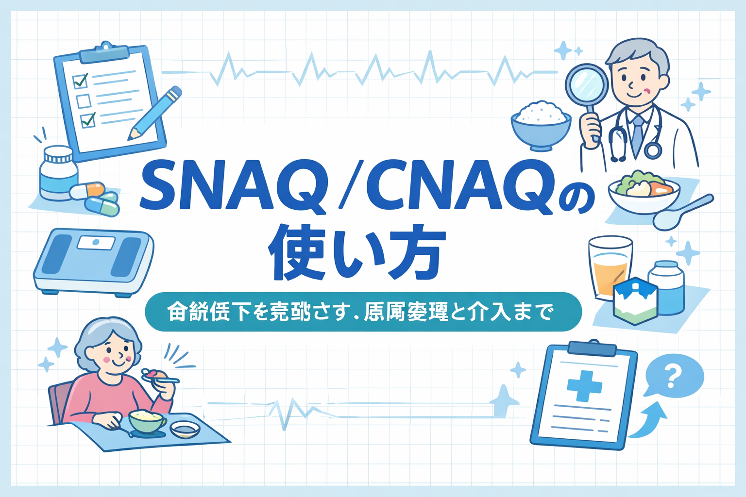 SNAQ( Simplified Nutritional Appetite Questionnaire )と CNAQ( Council on Nutrition Appetite Questionnaire )は、食欲低下の有無と栄養リスクを短時間で把握するための質問票です。現場では、点数を出して終わるのではなく、低スコアの背景を整理し、介入と再評価までつなげることが重要です。