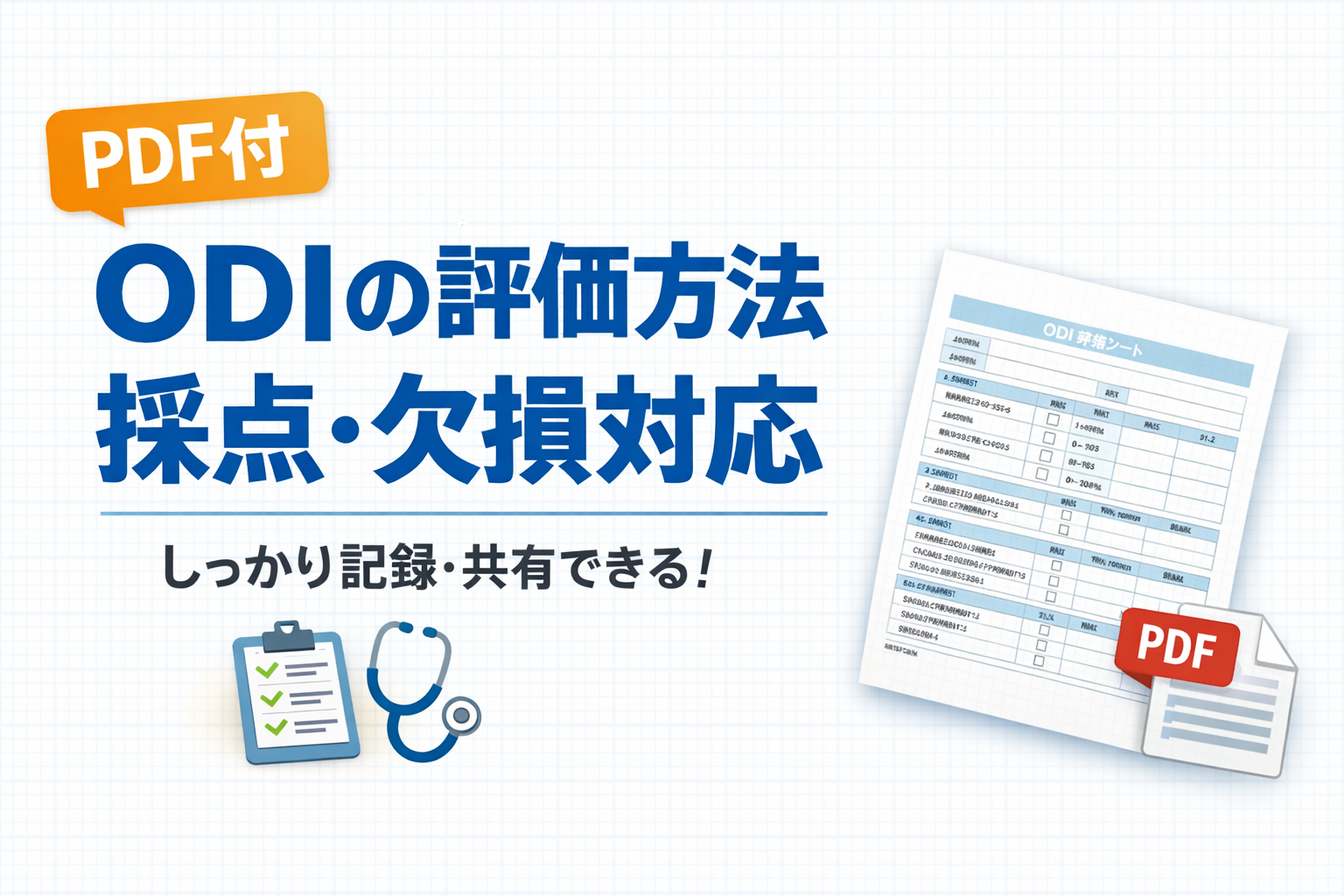 ODI の採点と記録を紙でそろえたい方へ向けて、A4 1 枚の記録シート PDF を用意しました。患者情報、固定条件、採点欄、再評価メモを 1 ページでまとめられる構成です。