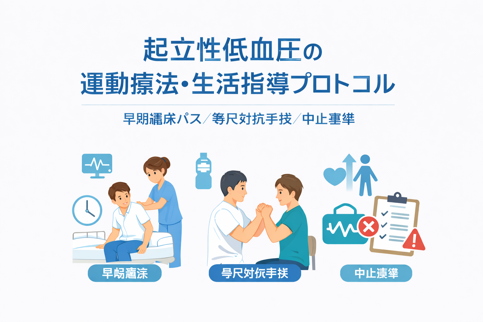本記事では「起立性低血圧 リハビリ」「起立性低血圧 運動療法」「起立性低血圧 生活指導」を 1 ページで整理し、早期離床パス・等尺対抗手技・段階的運動・起立時モニタリング・中止基準・チーム連携まで、病棟・外来でそのまま使える 実務プロトコル として提示します。定義や検査・評価の基礎は 起立性低血圧の基礎(定義・診断・注意点) を参照してください。