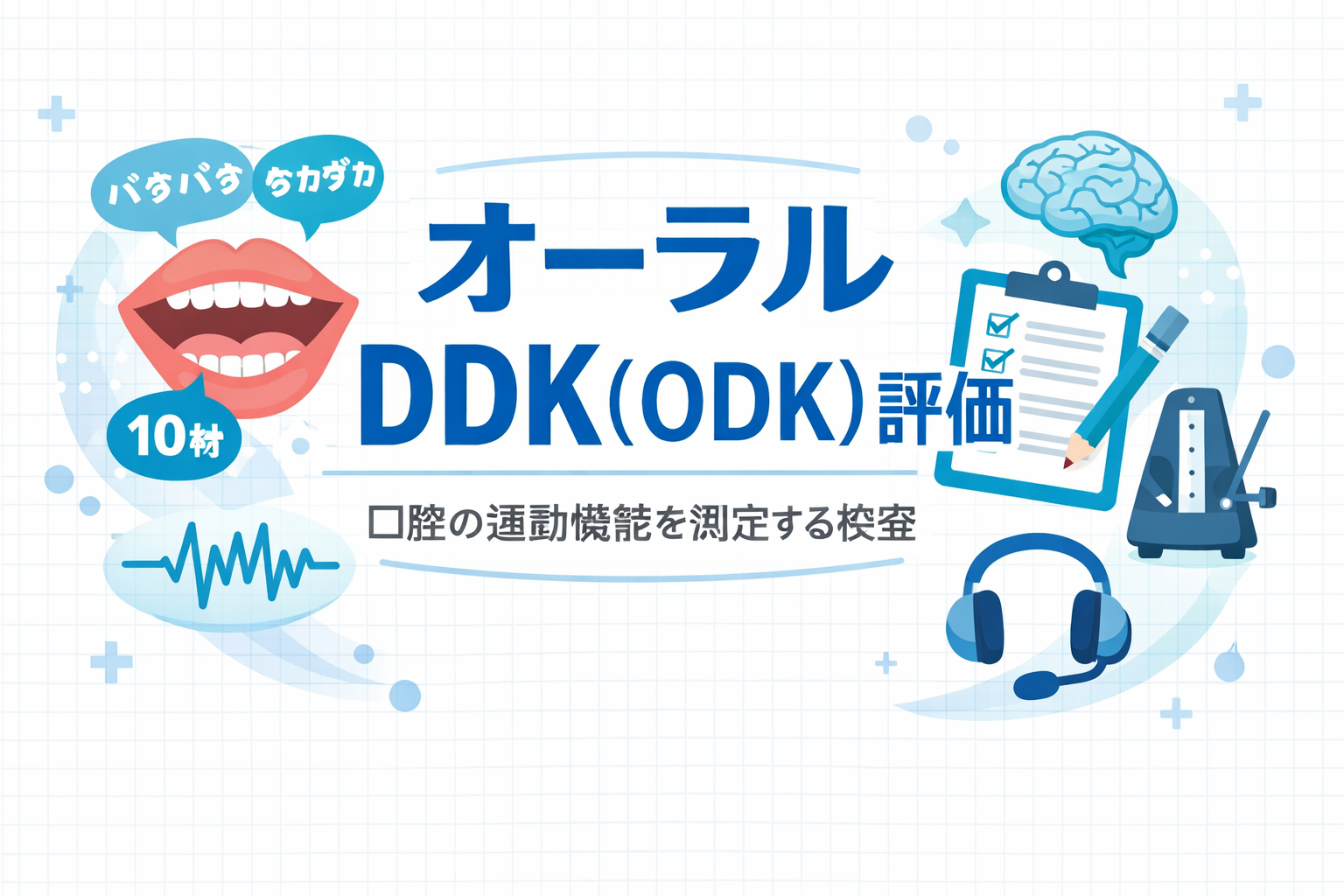 オーラル DDK( ODK )は、/pa/ /ta/ /ka/ を一定時間できるだけ速く反復し、「舌・口唇の運動速度(回/秒)」をみる簡便評価です。摂食・嚥下のリスク把握や、口腔機能低下症のスクリーニングに組み込みやすい一方で、測定条件が曖昧だと数値が簡単に変わるのが落とし穴です。