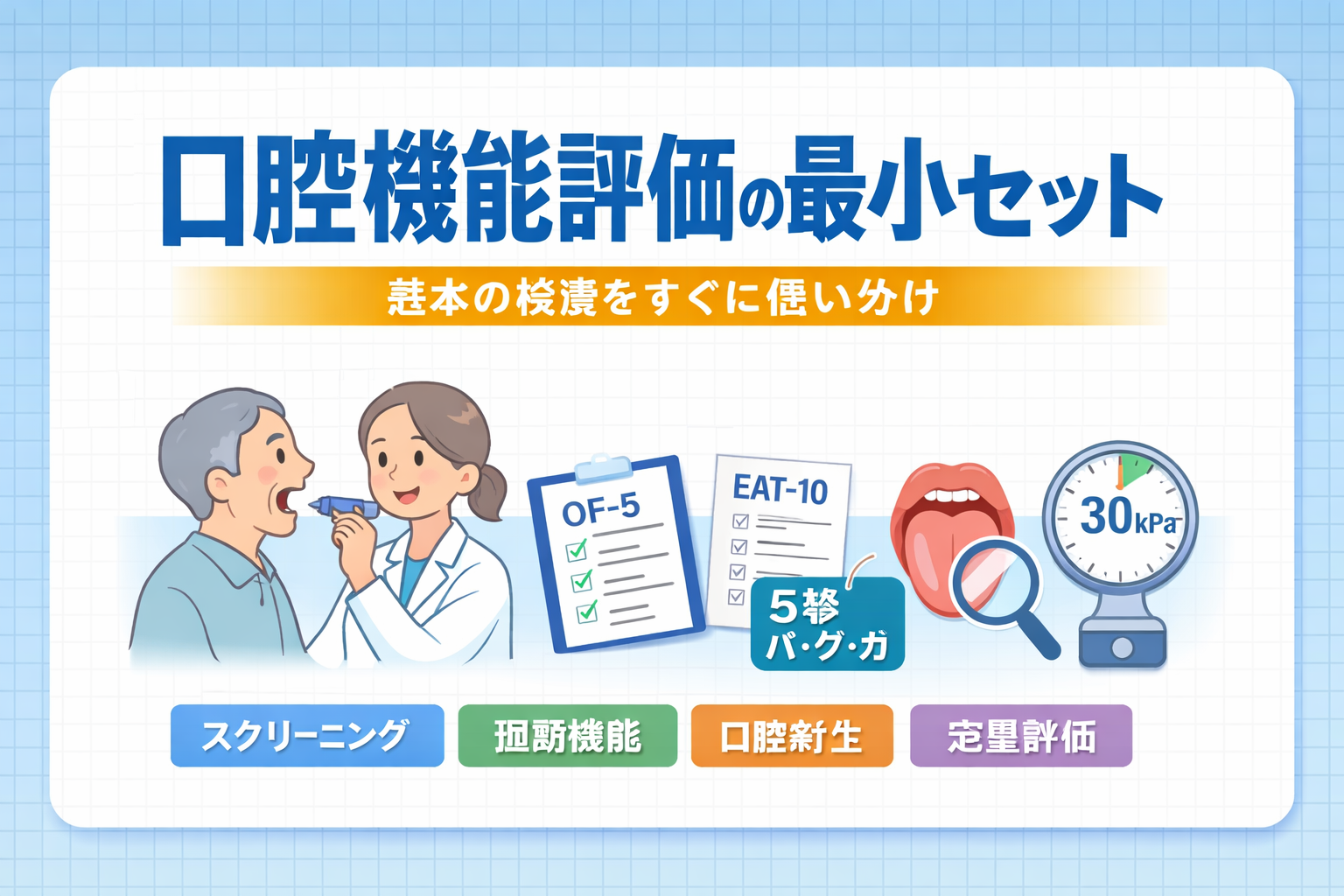 本記事で決めるのは、「どの場面で、どの口腔機能評価を先に使うか」です。地域・病棟・施設・訪問で迷いやすい OF-5、EAT-10、オーラル DDK( ODK )、舌苔スコア( TCI )、舌圧を、目的別の最小セットで整理します。