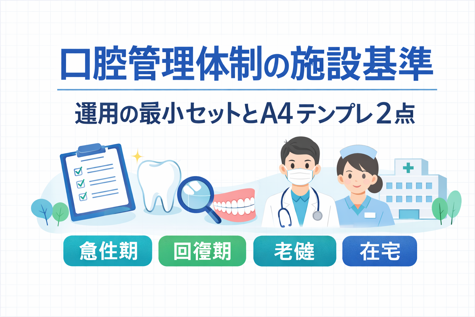 本記事では、体制(施設基準)を軸にしながら、誤嚥性肺炎予防に直結する運用と記録の型までを “最小セット” に落とします。さらに、自己点検と共有に使える A4 テンプレ 2 点もセットで用意します。