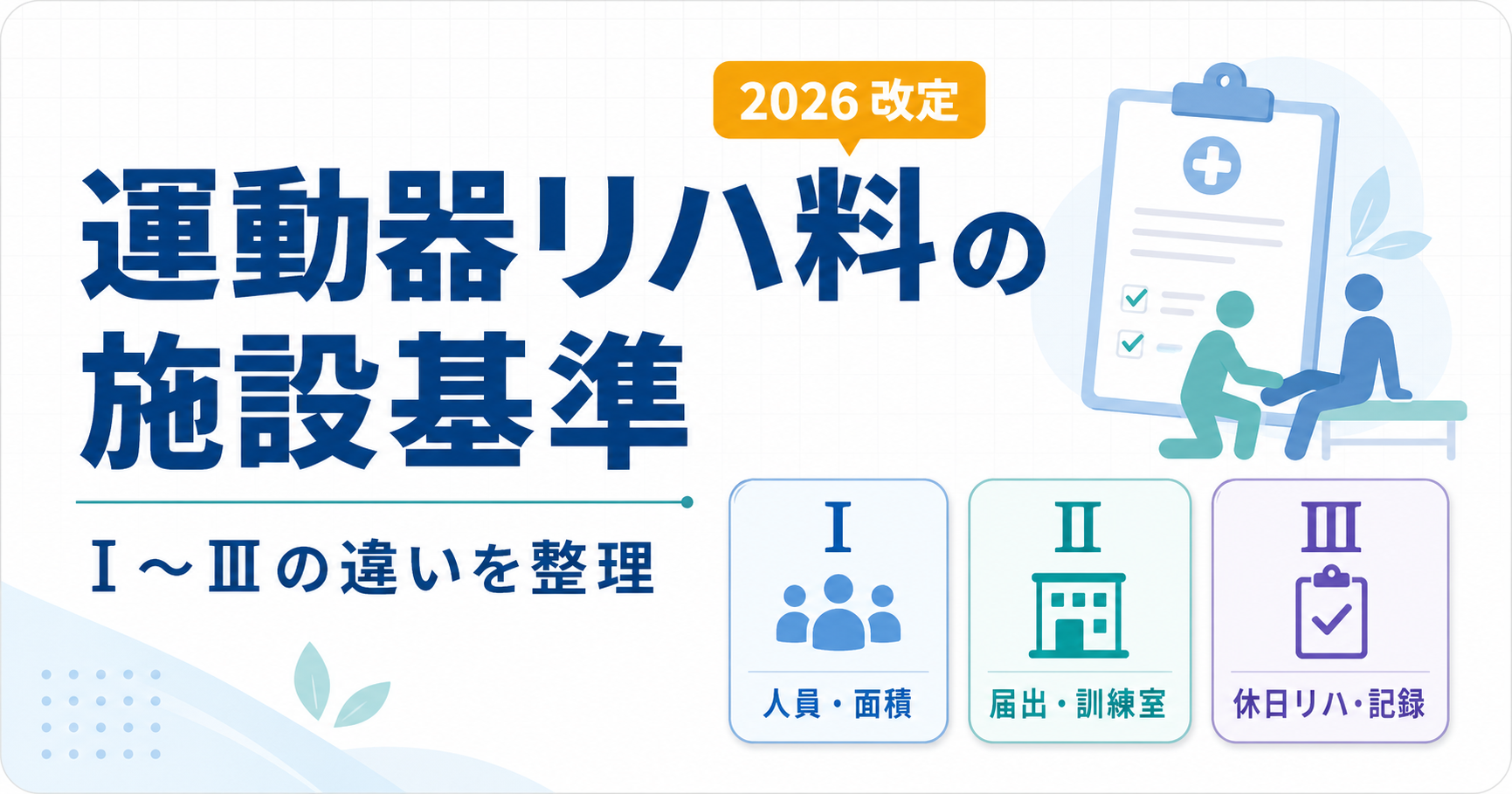 この記事では、運動器リハビリテーション料 Ⅰ ・ Ⅱ ・ Ⅲ の違いを、人員配置、専用機能訓練室、届出様式、休日リハ、ベッド上のみリハの注意点から整理します。 5 区分全体の位置づけから確認したい場合は、先に 疾患別リハビリテーション料とは? 5 区分・日数・単位 を読むと、 H002 の位置づけがつかみやすくなります。