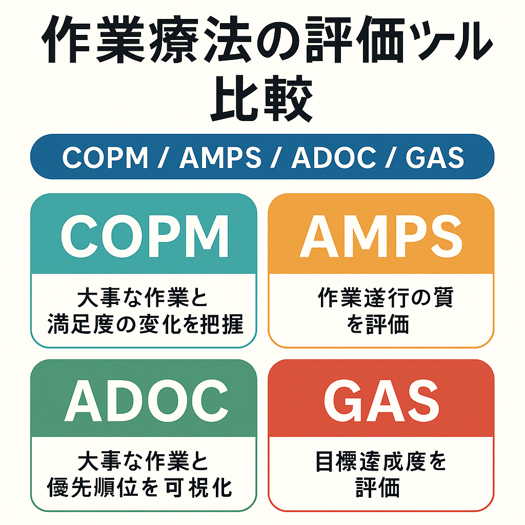 本記事は、作業療法士が日々の臨床でよく耳にする評価ツール( COPM / AMPS / ADOC / GAS )を「何ができる道具なのか」「どの場面で選ぶのか」という視点で整理することをねらいとしています。どれも名前だけは知っているけれど、自施設では導入されていない、使ったことがないという方も少なくありません。