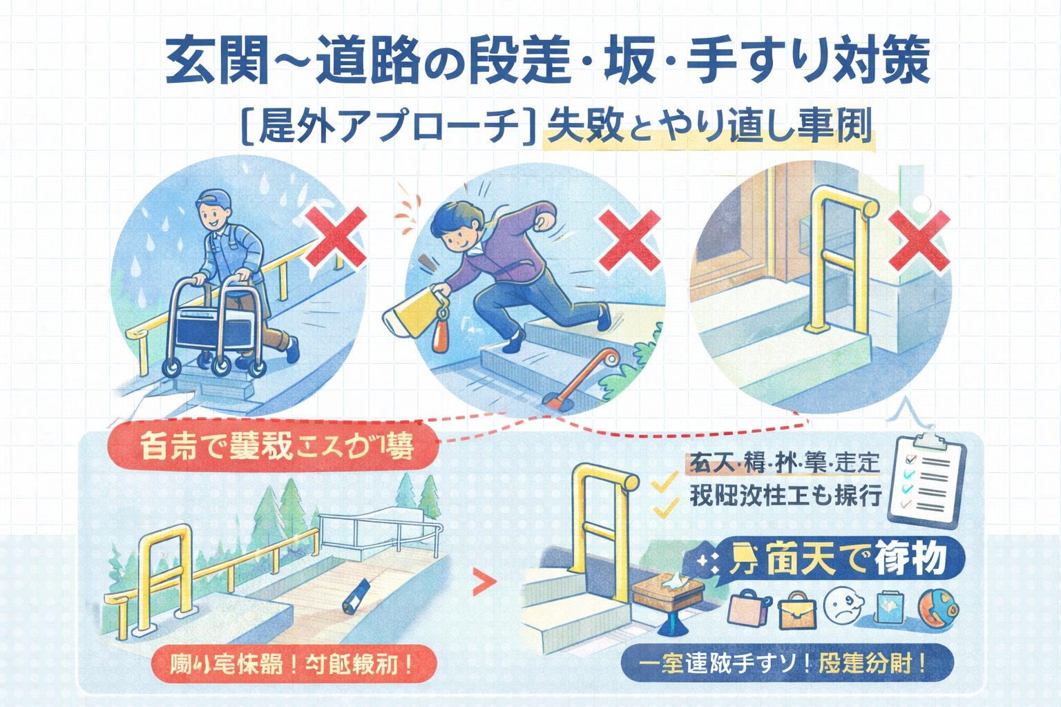 玄関〜道路の段差・坂・手すり対策【屋外アプローチ】失敗とやり直し事例