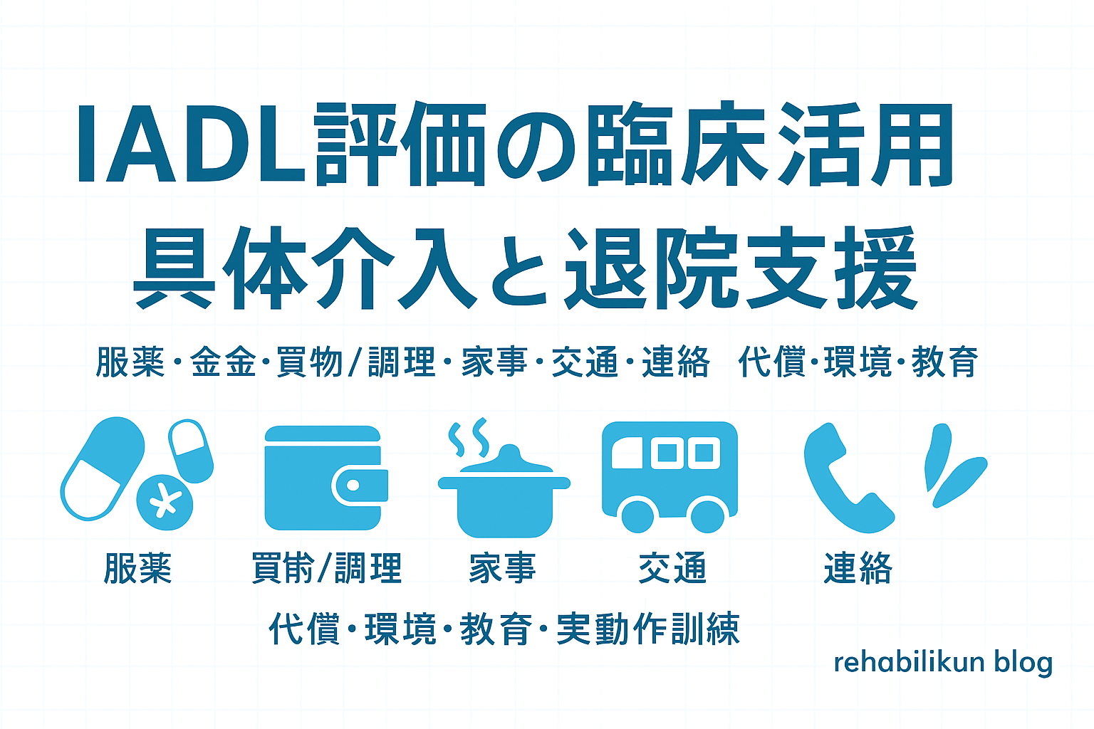 ADL と IADL の違いがあいまいな若手 PT・OT 向けに、定義と覚え方(DEATH・SHAFT)、BI・FIM・Lawton・老研式・FAI の使い分け、リハビリでの評価フローを理学療法士の視点で整理します。