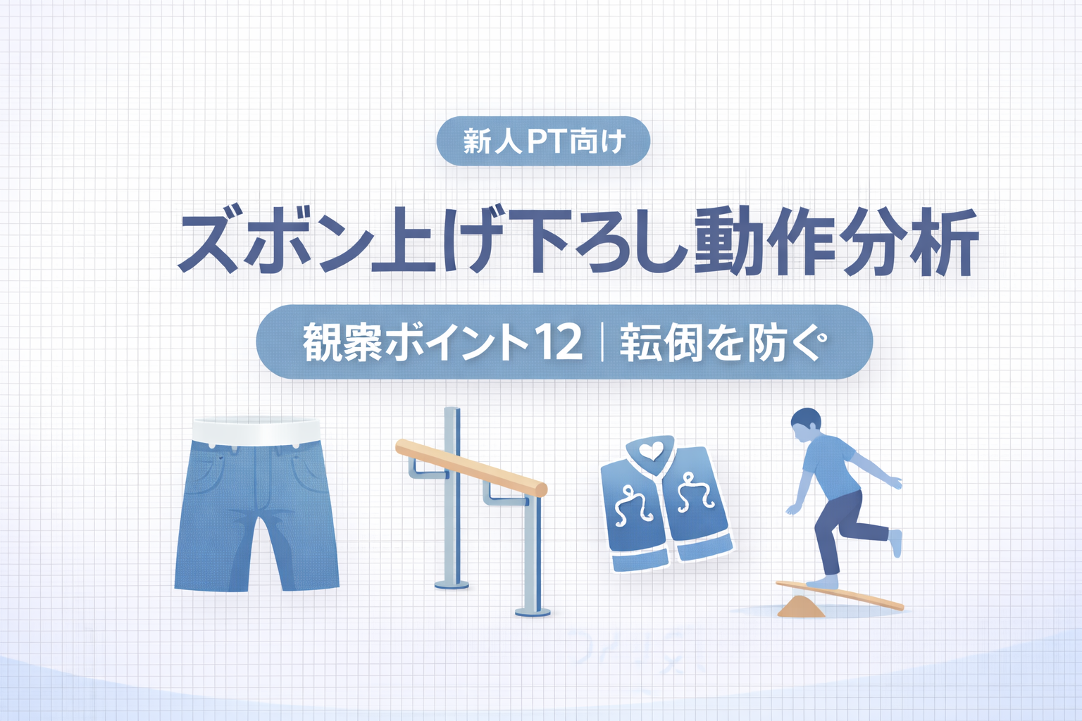 ズボン上げ下ろしは連続動作に見えますが、実際は支持(立位)→片脚支持→骨盤操作→手の操作の組み合わせです。新人は「ふらつく」で終わらせず、まずはどの要素が破綻しているかを 1 つに絞ります。