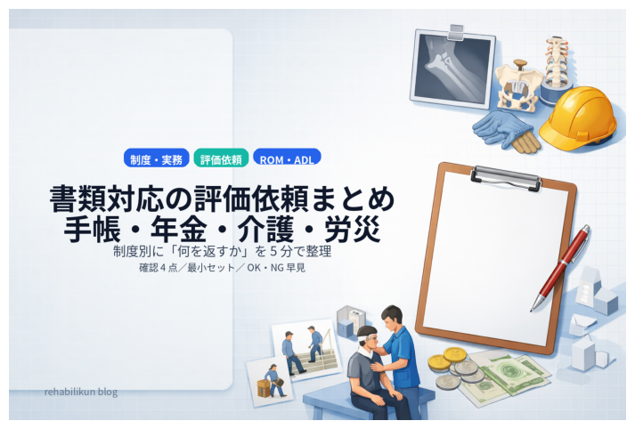 身体障害者手帳、障害年金、要介護認定、労災、交通事故の後遺障害、補装具費支給などでは、医師の書類作成にあたり ROM ・筋力・ ADL ・移動の「裏づけ所見」が必要になります。そのため現場では、リハ職に評価・計測の依頼が来ることがあります。