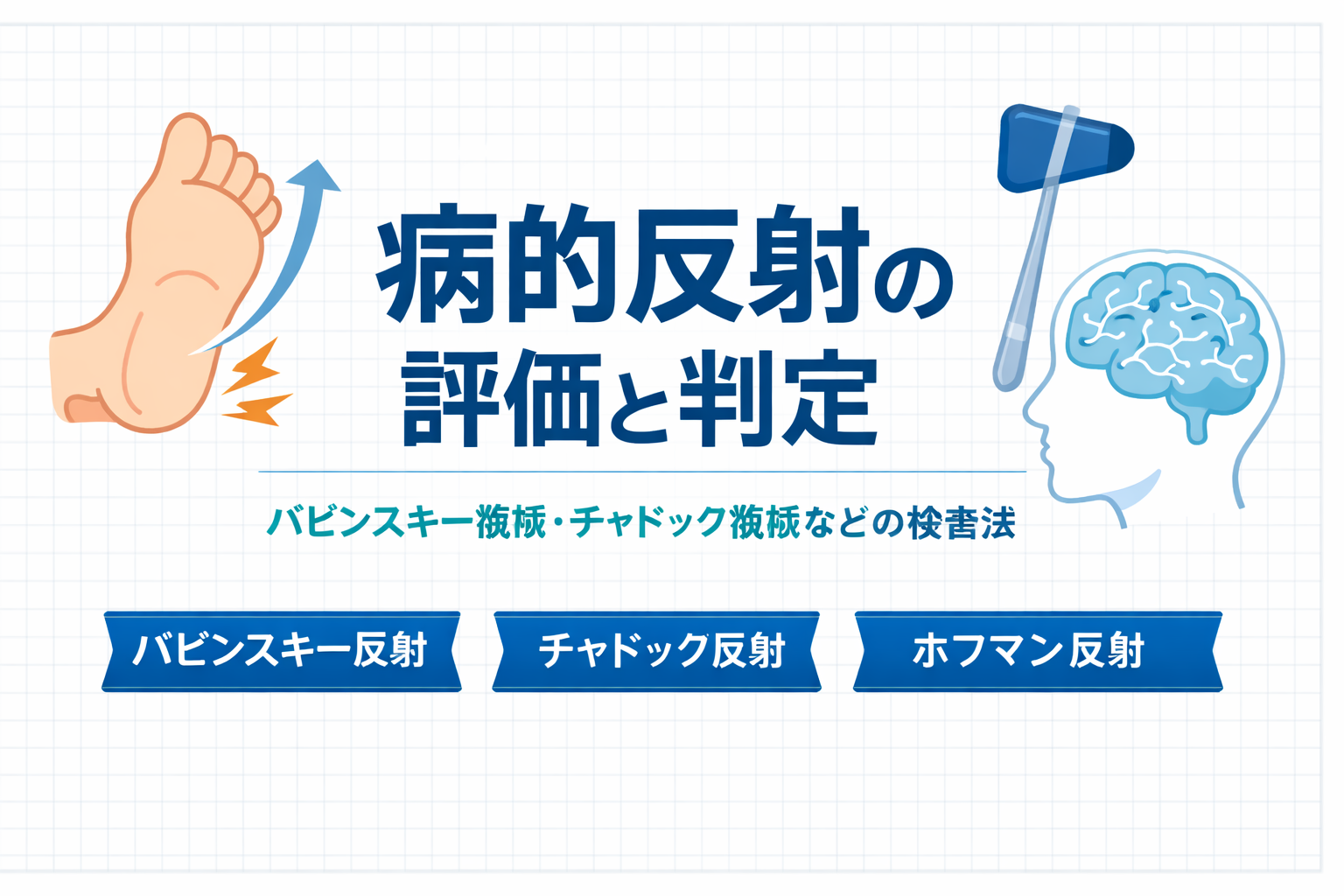 病的反射は単独で病巣を断定せず、深部腱反射( DTR )の亢進、筋緊張、運動/感覚所見、歩行観察と「束」で解釈します。反射検査の全体フロー(体位セット、 DTR の見方、記録の型)は、親記事の 反射検査 完全ガイド を参照してください。