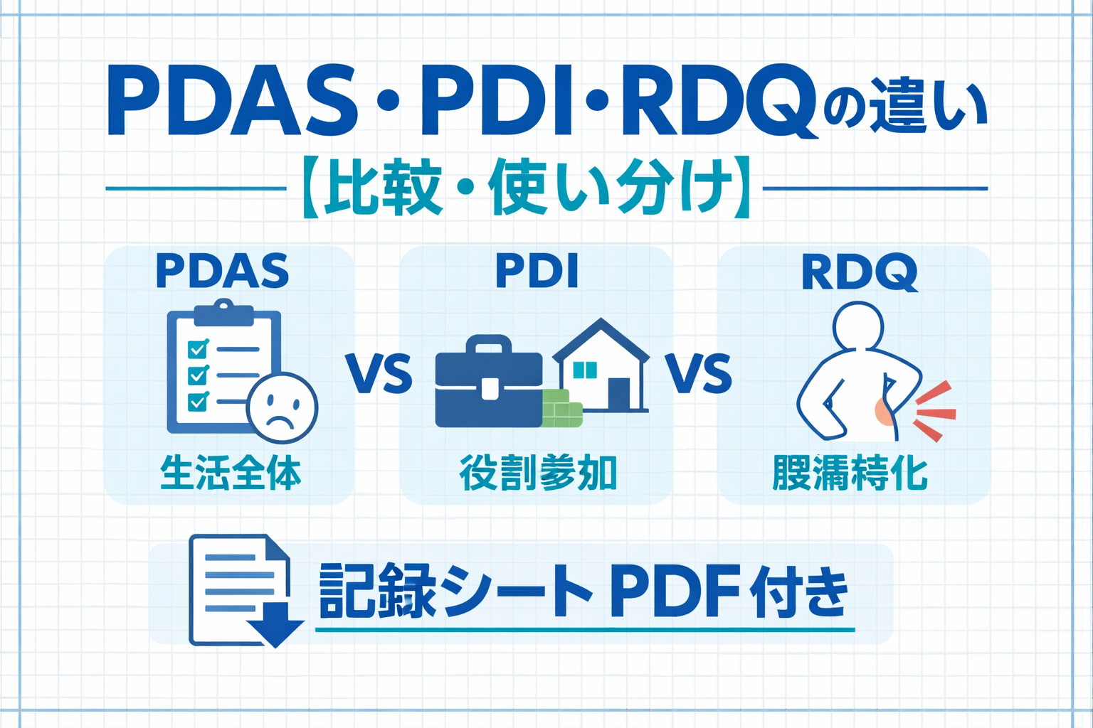 - RDQ は腰痛以外に使わない:RDQ は腰痛特異的です。頚部痛・肩痛・全身痛では PDAS / PDI を優先し、必要があれば疾患特異尺度を 1 本だけ追加します。