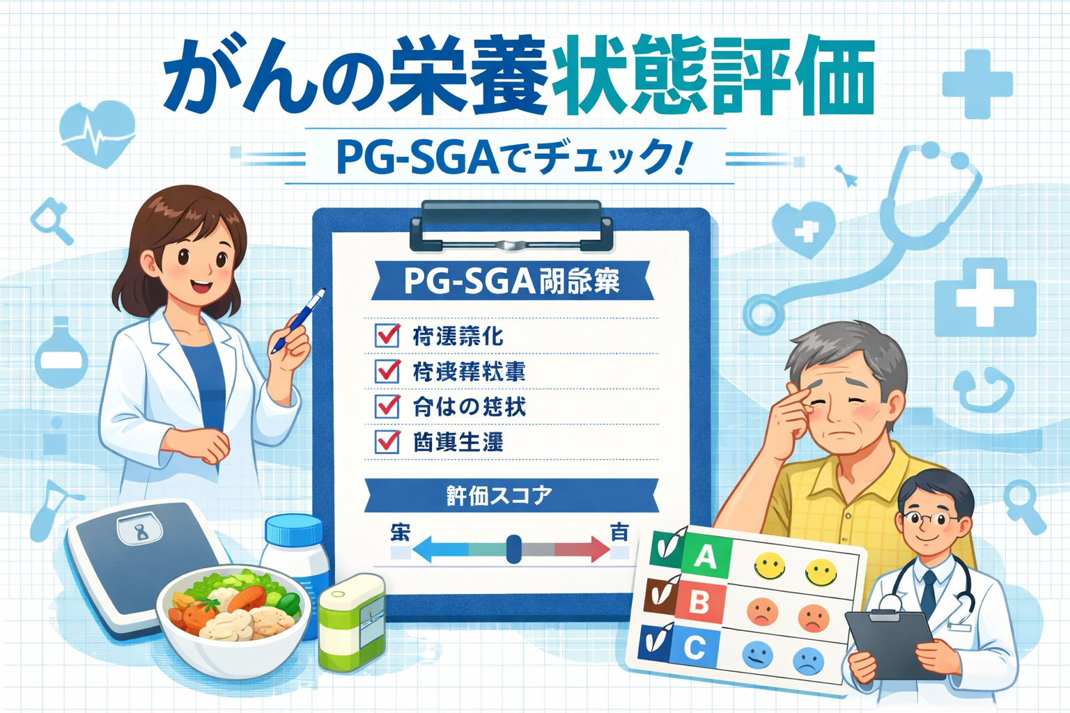 まず固定したいのは、PG-SGA には2 つの見方があることです。1 つは合計点で介入優先度をみる「数値スコア」、もう 1 つは全体像をみる「A / B / C の総合判定」です。ここが混ざると、記録もチーム内共有も崩れやすくなります。