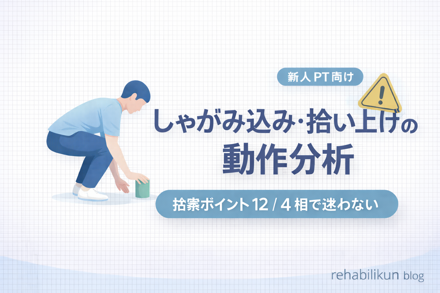 本記事では、しゃがみ込み・拾い上げを 4 相(準備→下降→把持→立ち上がり)で相分けし、観察ポイントを表で固定します。結論として、失敗は多くの場合「準備(足・物・支持)」「下降の戦略(股関節主導か腰主導か)」「把持時の停止」のどこかで起きます。