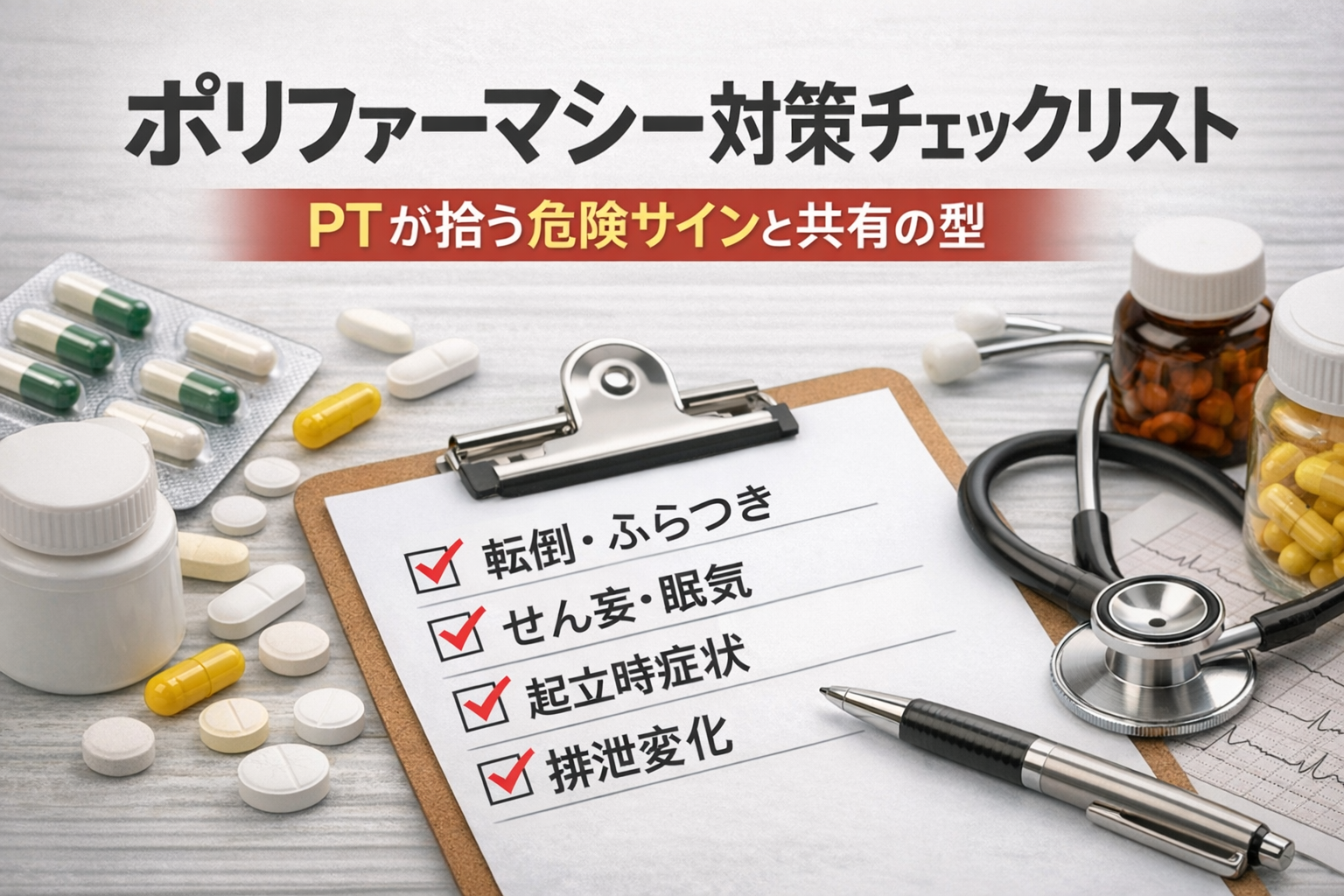 結論:ポリファーマシー対応で PT が最初にそろえるべきなのは、薬の知識を広く暗記することではなく、転倒・せん妄・起立時症状・過鎮静・排泄変化を同じ順番で拾い、いつから悪くなったかを短く共有できる型です。ポリファーマシーは「薬が多いこと」そのものではなく、有害事象や服薬困難につながる状態を含めて考えます。