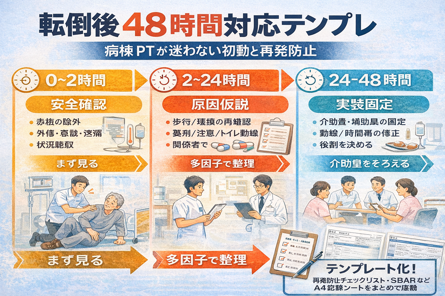 この記事で答えるのは、病棟で転倒が起きた直後から 48 時間までに、 PT が何を先に見て、どこまで共有し、どう再発防止へ落とすかです。結論は、赤旗の除外 → 多因子で原因仮説 → 介助量・補助具・動線・時間帯を固定の順に回すと、担当が変わっても抜けにくくなります。