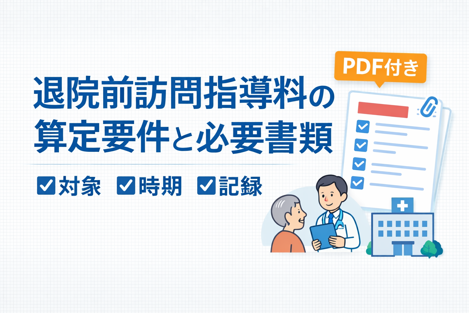 退院前訪問指導料は、単独の書類テーマに見えて、実際には退院支援の運用設計とつながっています。まずはこの記事の PDF で確認項目を固定し、そのうえで関連テーマを 2 〜 3 本つなげて読むと、制度と現場が結びつきやすくなります。