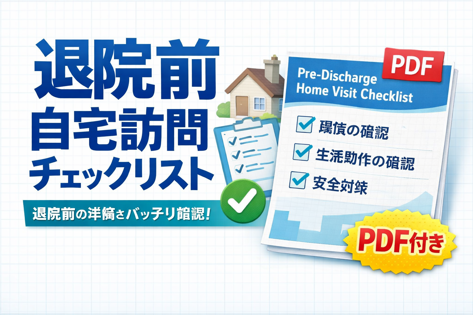 本記事は、退院前訪問指導の当日運用に絞った実践ページです。対象は、初めて家屋調査を担当する新人や、毎回「見すぎて終わらない」と感じやすい療法士です。持ち物、場所別チェック、記録 3 行テンプレ、当日 5 分チェックまで一気に整理し、「何を見て、どう書いて、どう終わるか」を固定します。