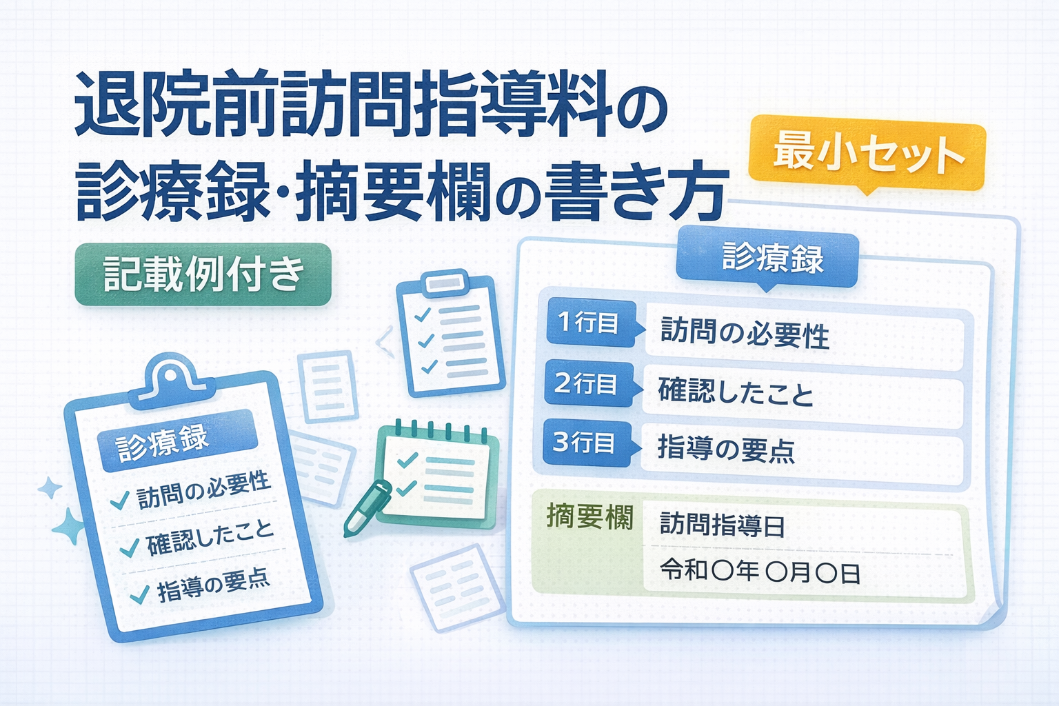 本記事では、退院前訪問指導料の総論ではなく、診療録と摘要欄の書き方に絞って整理します。まずは「診療録 3 行」「摘要欄 1 行」の最小型を固定し、そこから院内テンプレへ広げる流れで考えます。算定要件や評価表 PDF から確認したい方は、退院前訪問指導料の算定要件と必要書類【評価表 PDF 付き】もあわせて確認してください。