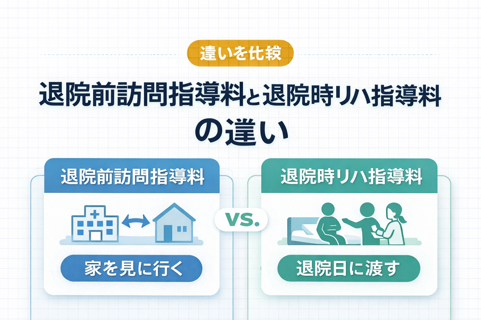 違いは日付ではなく目的です。退院前訪問指導料は患家を訪問して在宅療養を具体化する点数で、退院時リハビリテーション指導料は退院日に患者・家族へ訓練や生活指導を渡す点数です。請求日が同じでも、役割は同じではありません。